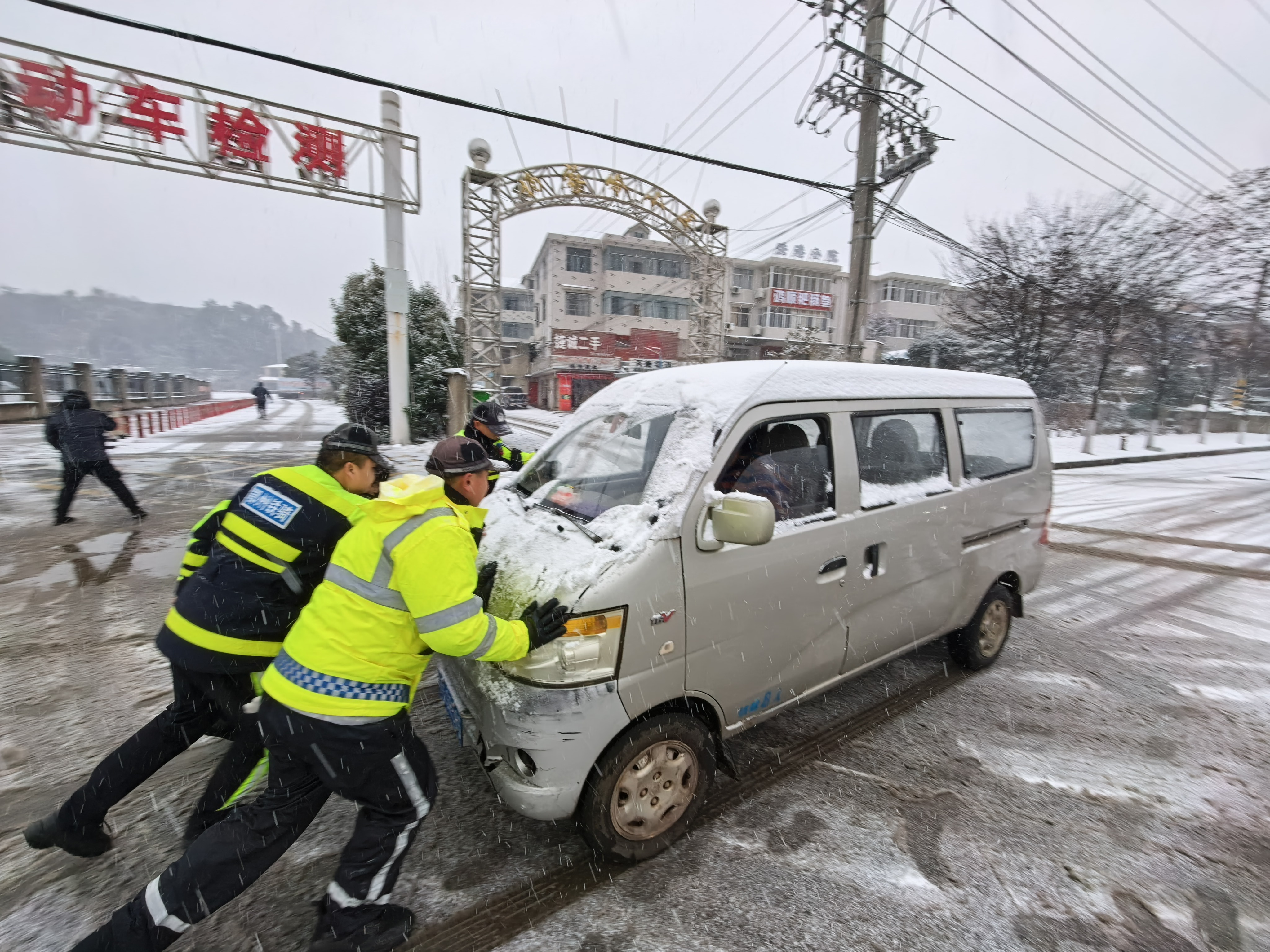 雪落无声,守护有力。10时许,鄂州市公安局交通管理支队临空大队三中队民警巡逻时,发现一辆小型轿车因道路湿滑原地打转,无法自主脱困。民警立即上前查看情况,一方面提醒过往车辆减速避让、注意安全,另一方面组织人员对该车进行施救。经数次尝试,原地打转的小车终于被成功推出;梁子湖大队巡逻民警巡查至凤凰大道碧桂园路段时,发现一辆大货车打滑,紧急协助救援并联系城管部门开展撒盐除雪工作。
