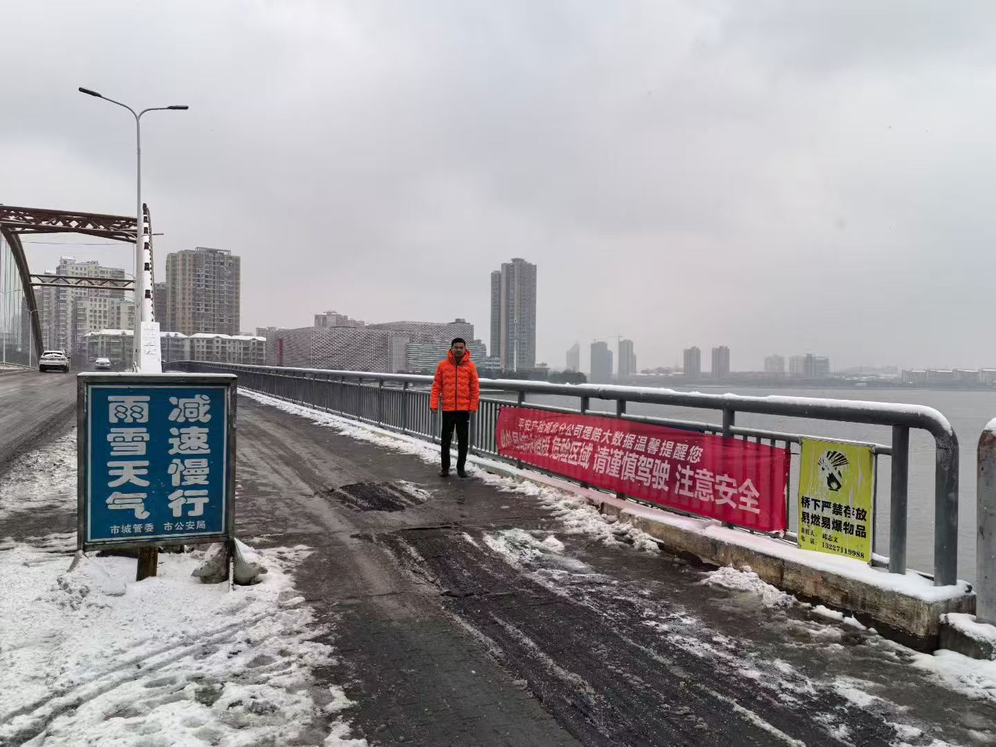 在鄂城区凤凰大桥、南浦虹桥等易结冰的桥梁、坡道等重点路段,平安产险鄂州中支布设了醒目安全警示横幅,提醒过往车辆“此处易结冰路段,危险区域,请谨慎驾驶,注意安全。”
