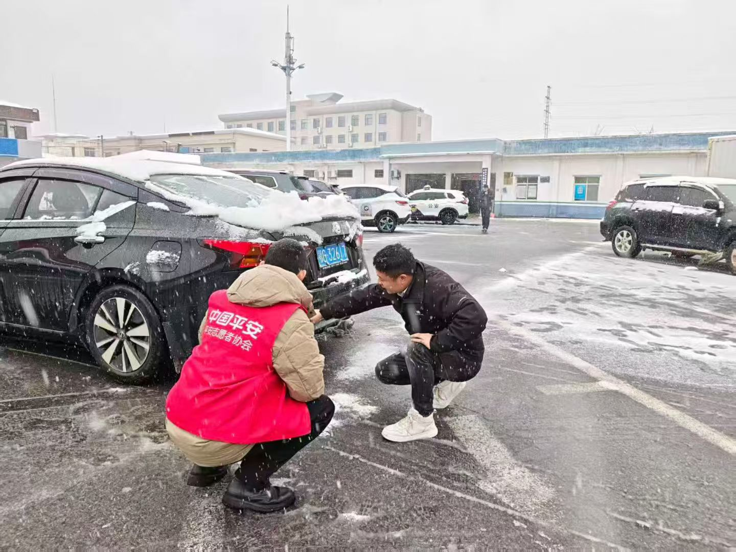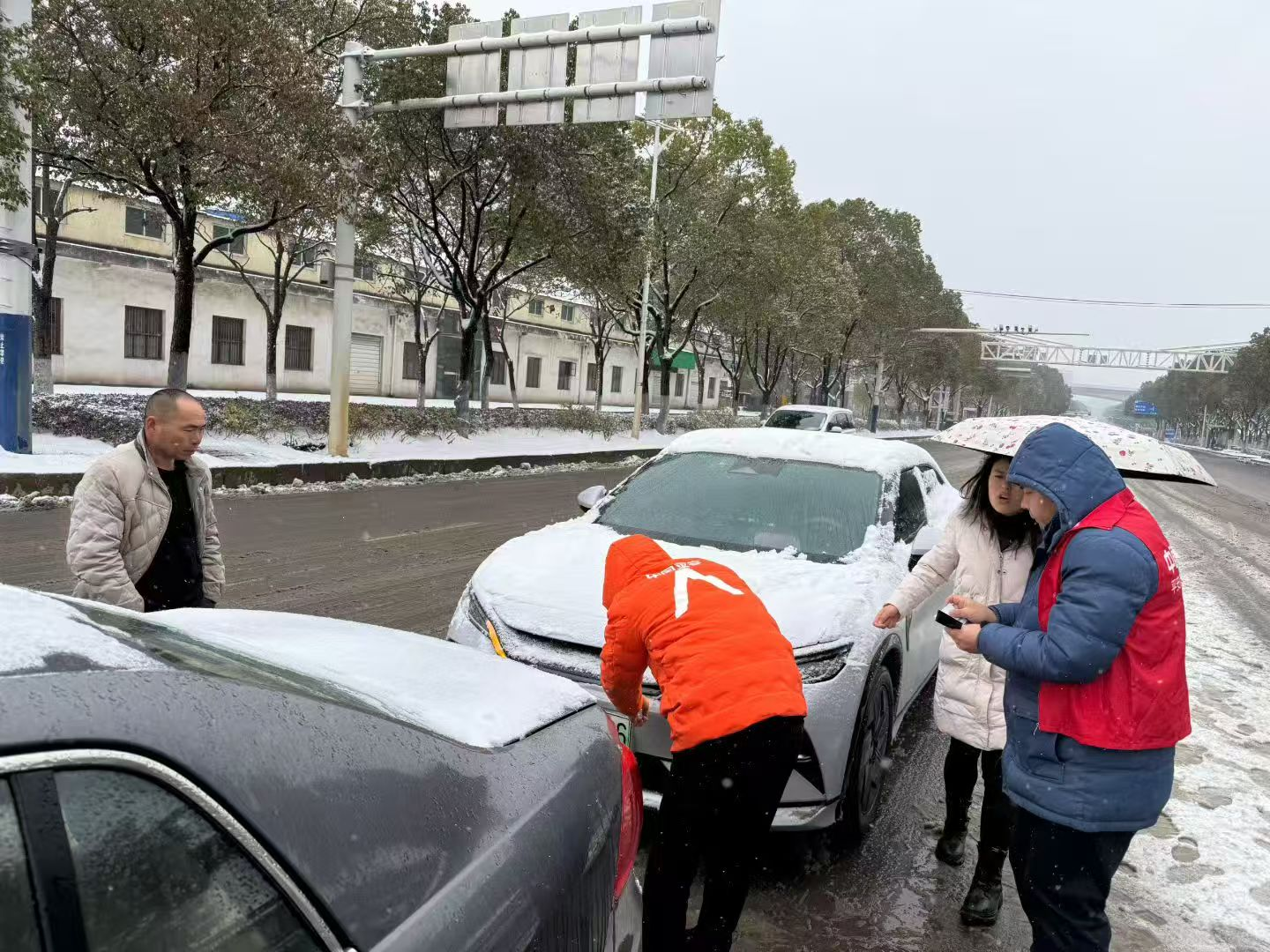 同时,救援队员们身着志愿者马甲,对因打滑、碰撞、被困的车辆进行紧急救援,协助车主理赔。