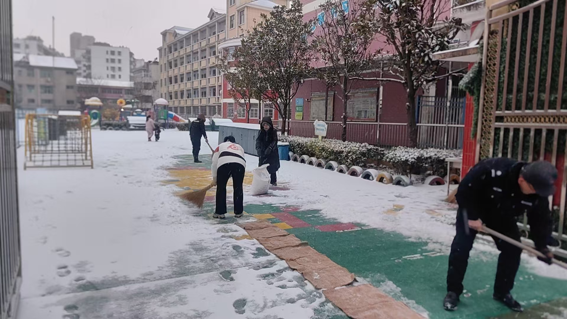 天刚蒙蒙亮,燕矶中学、燕矶小学的校园里已一片忙碌。教职工与保安们手持工具,对校园内外通道、教学楼门口、操场等区域展开集中清扫,铁锹铲雪的“叮当”声、扫帚扫雪的“簌簌”声交织成冬日里的暖心乐章。与此同时,学校通过家校群实时推送天气预警、防寒防滑提示,细致叮嘱家长做好孩子上下学途中防护,家校同心筑牢校园安全“防护墙”,让孩子们的求学路温暖无虞。
