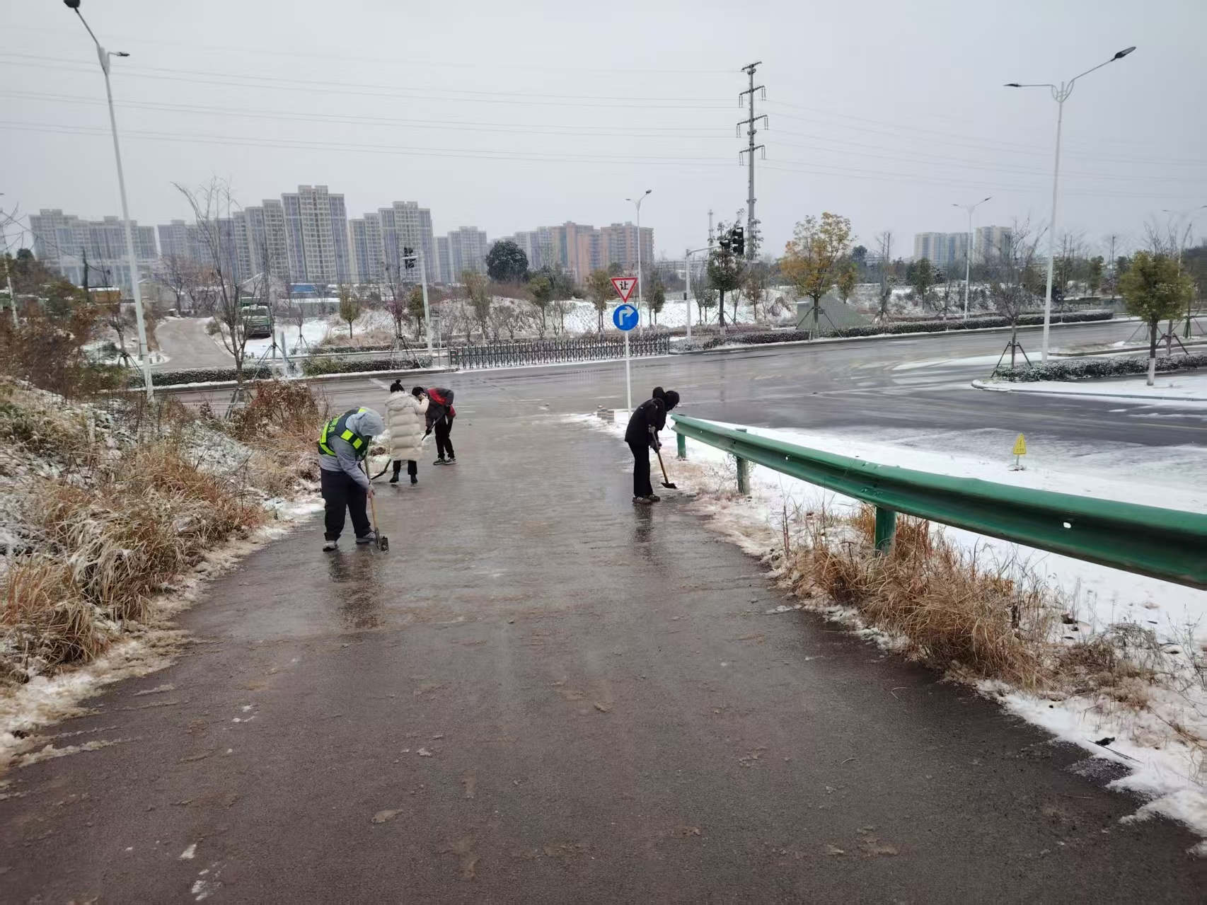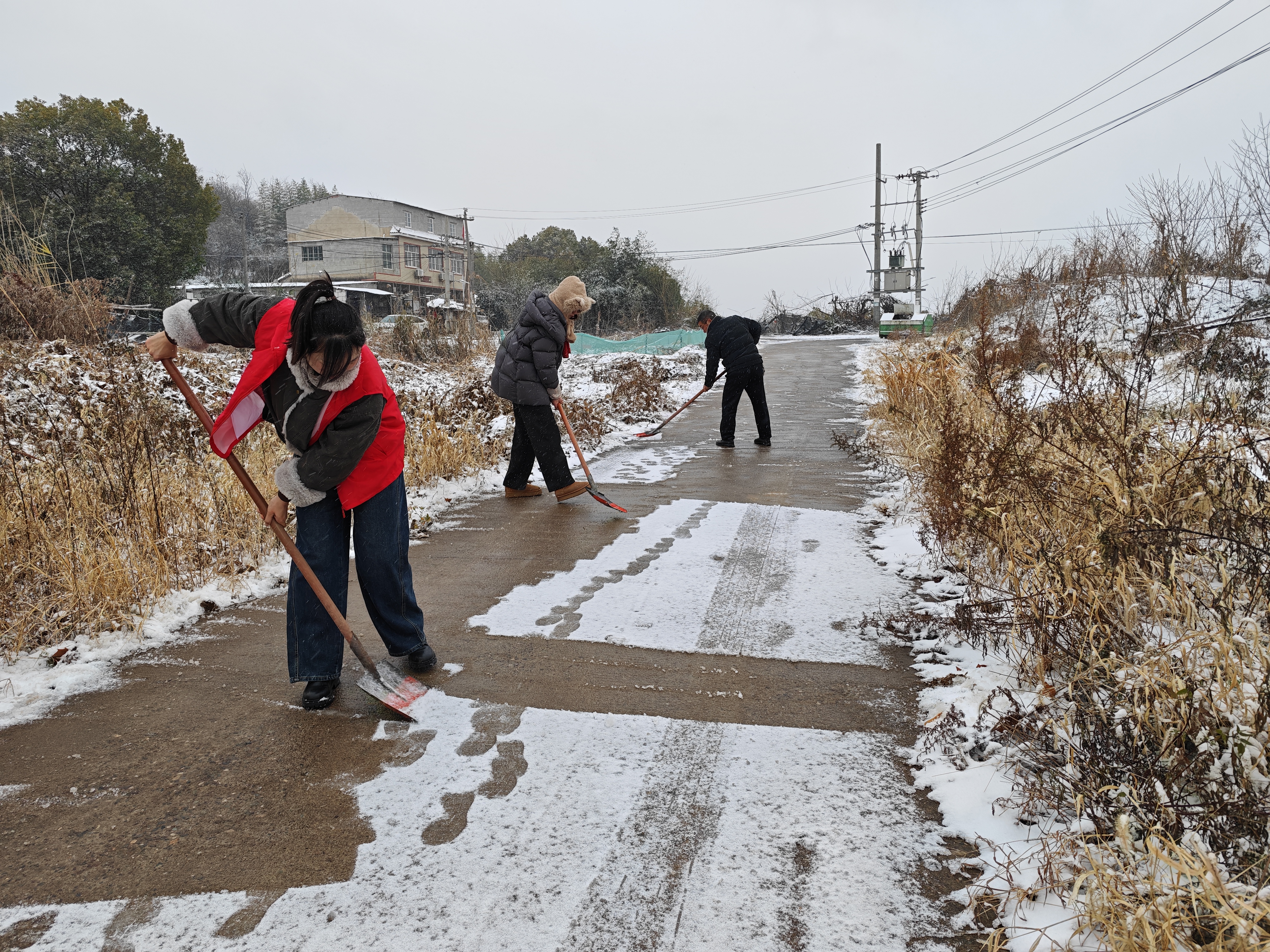 镇政府各部门闻令而动,迅速组建应急突击队,重点对政府门口、政务服务大厅出入口及责任路段开展扫雪除冰作业;乡镇主干道上、社区街巷里、老旧小区中,党员干部、社区工作者、志愿者们化身“破冰先锋”,铁锹、扫帚齐上阵,分工开展铲雪、撒盐、融雪工作;同样热火朝天的还有各村的除冰清雪战场,驻村工作组、村“两委”干部带头冲锋,党员志愿者、热心村民主动响应,大家自发携带工具,对村道、便民桥等重点路段集中清理。雪花落在肩头凝结成霜,双手冻得通红,但每个人的热情丝毫不减,用汗水融化冰雪,用行动传递温暖。