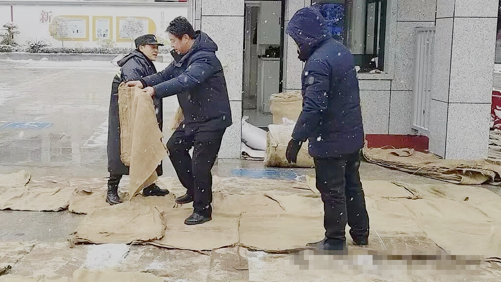 铁锹破冰的 “叮叮当当” 声、扫帚扫雪的 “唰唰” 声、同事间的互助提醒声,交织成校园冬日里最动人的劳动交响曲。大家分工协作、默契配合:三人一组合力推雪,专注清理台阶缝隙残雪,细心铺设防滑垫、撒布融雪盐,后勤人员则穿梭巡查、及时补给……