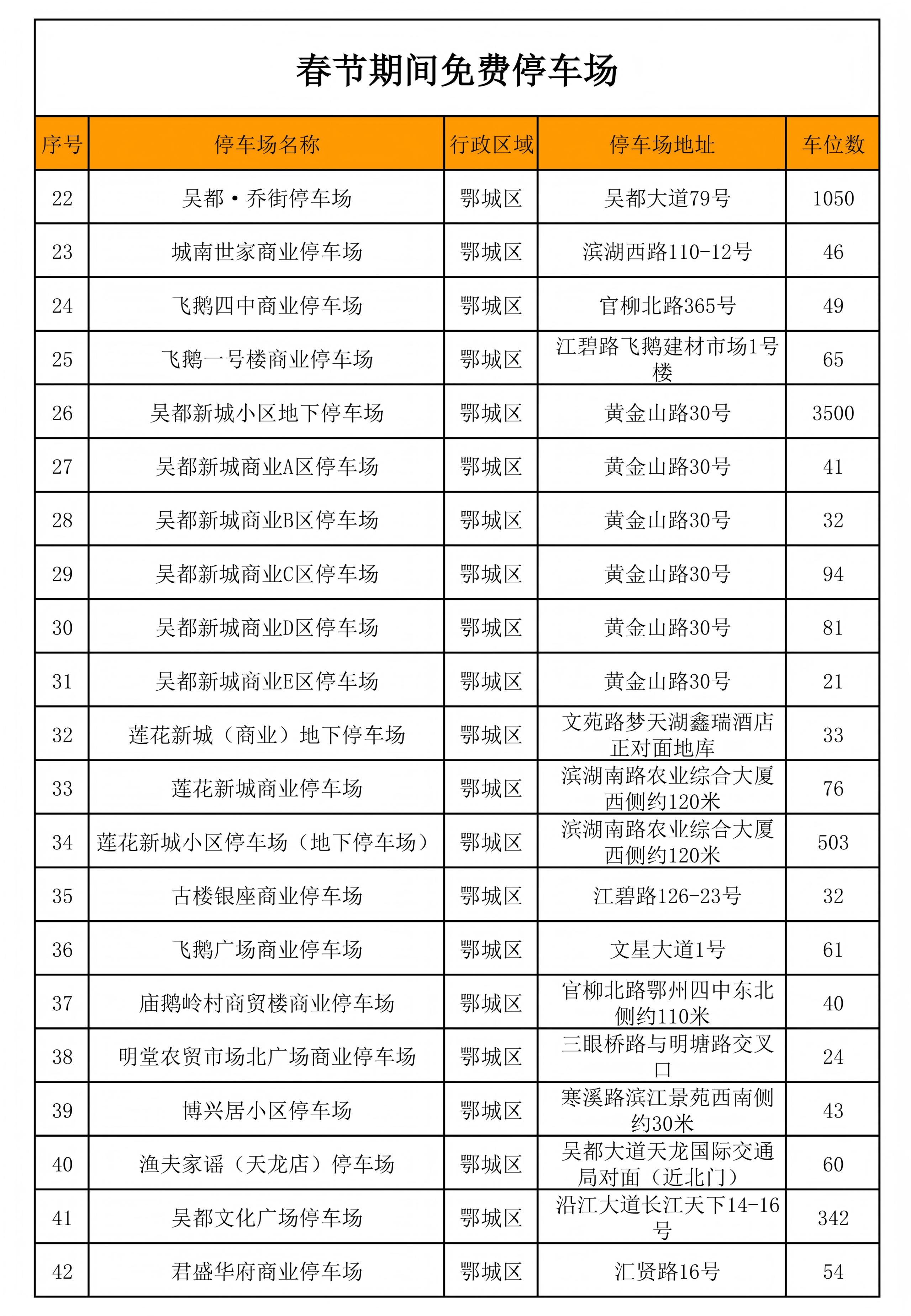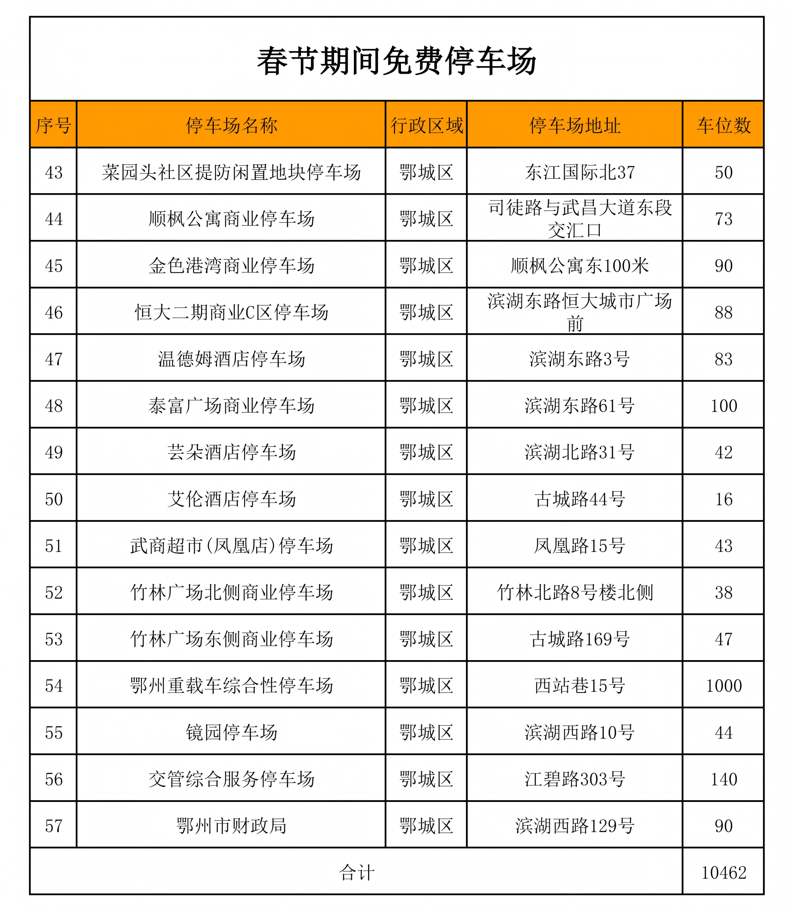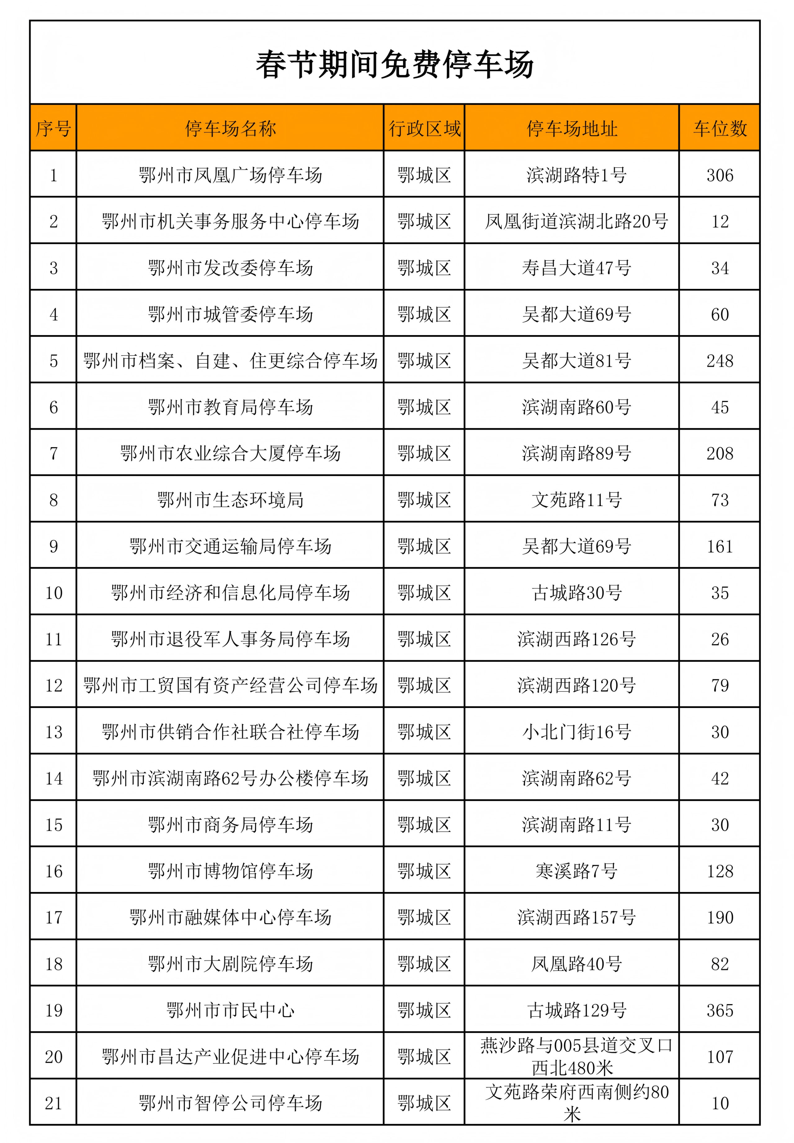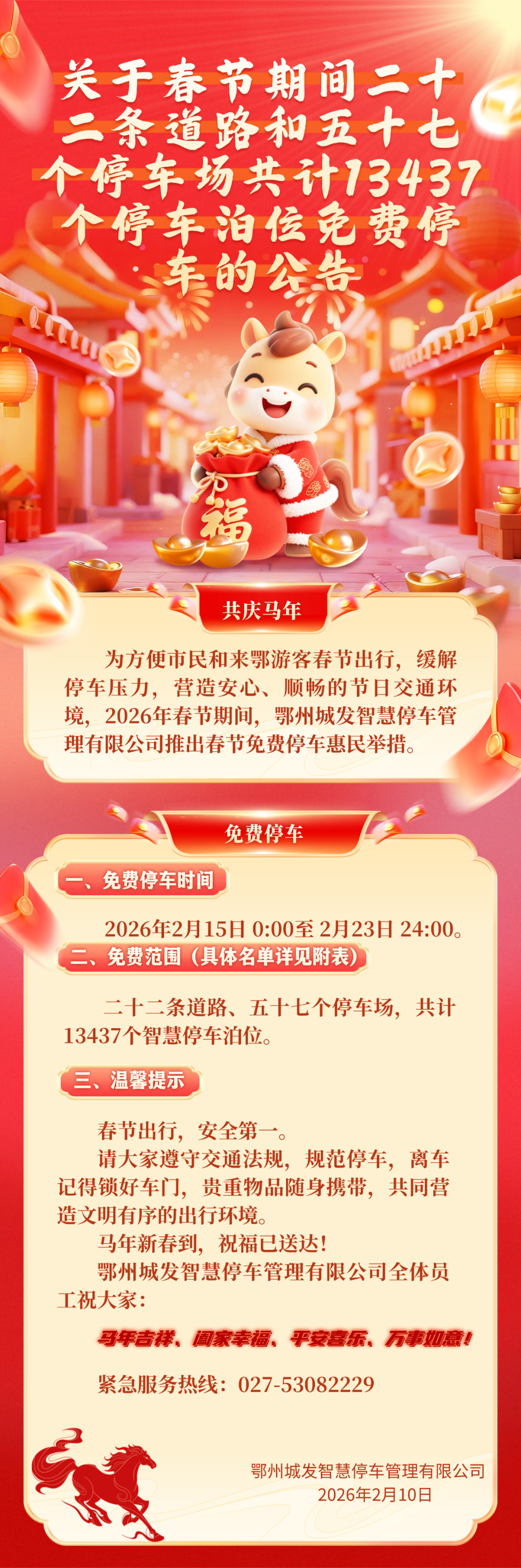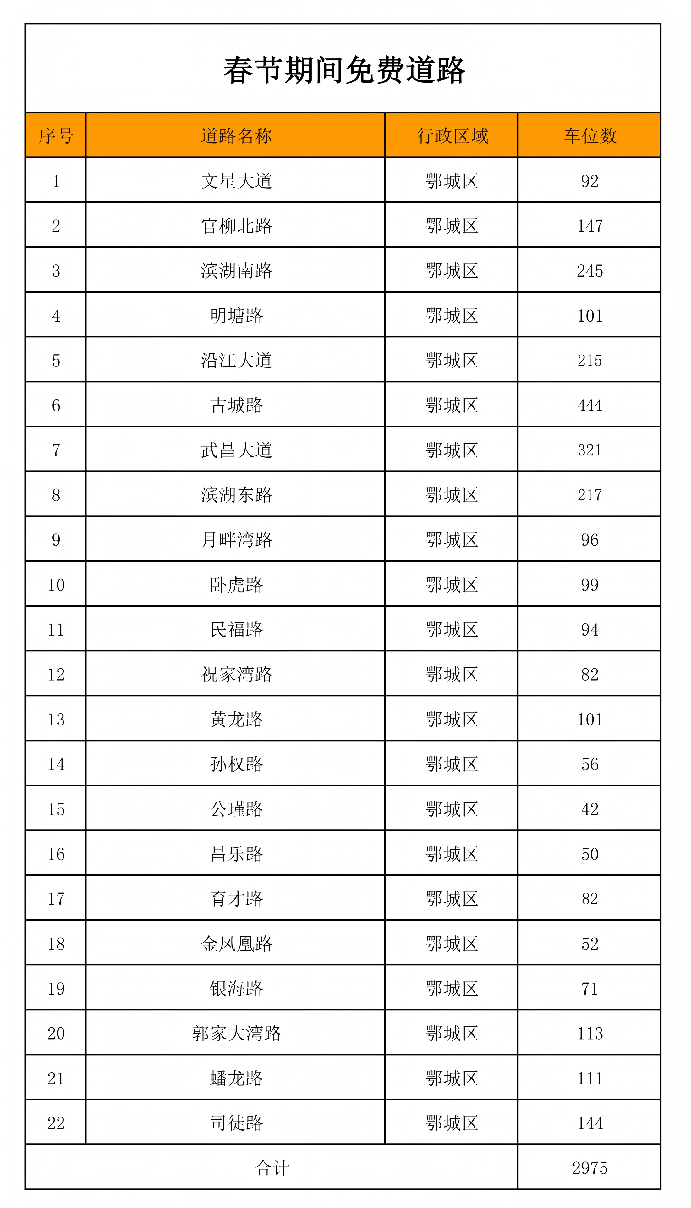 关于春节期间22条道路和57个停车场共计13437个停车泊位免费停车的公告