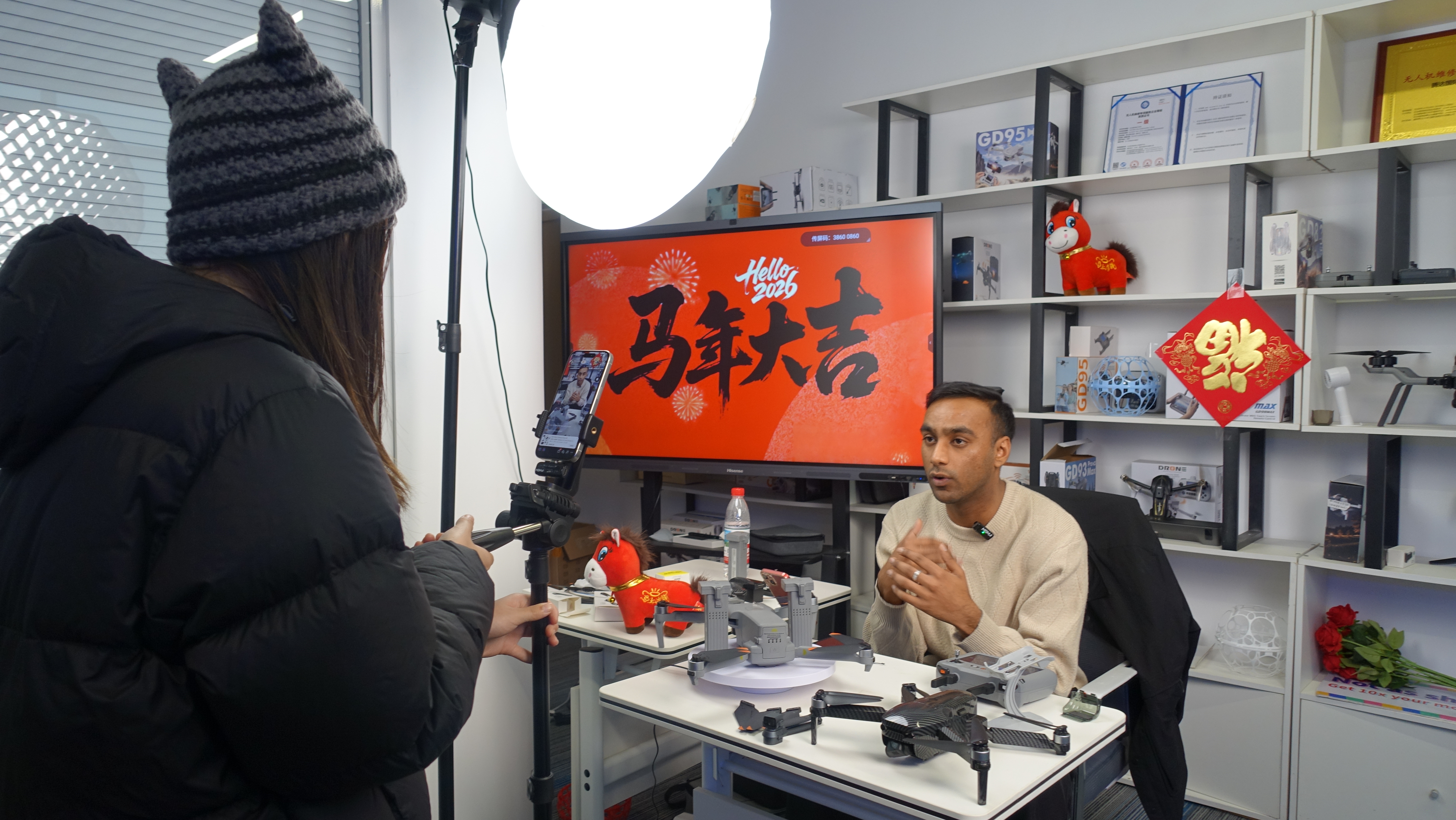 上午十点,腾达国际贸易(鄂州市)有限公司的直播间灯火璀璨,镜头旁的鲜红“福字”格外亮眼,“马上有钱”的红色小马点缀在背景货架上,整个直播间现场年味儿拉满。来自巴基斯坦的主播阿布手拿无人机产品,一边用流利的英语向北美观众推介产品,一边轻松聊着中国春节的热闹习俗。此时正值北美晚间休闲黄金时段,弹幕瞬间刷屏,咨询不断。喜庆的新春布景搭配火热的直播氛围,让这间小小的直播间成为连接中国与世界的热闹窗口。