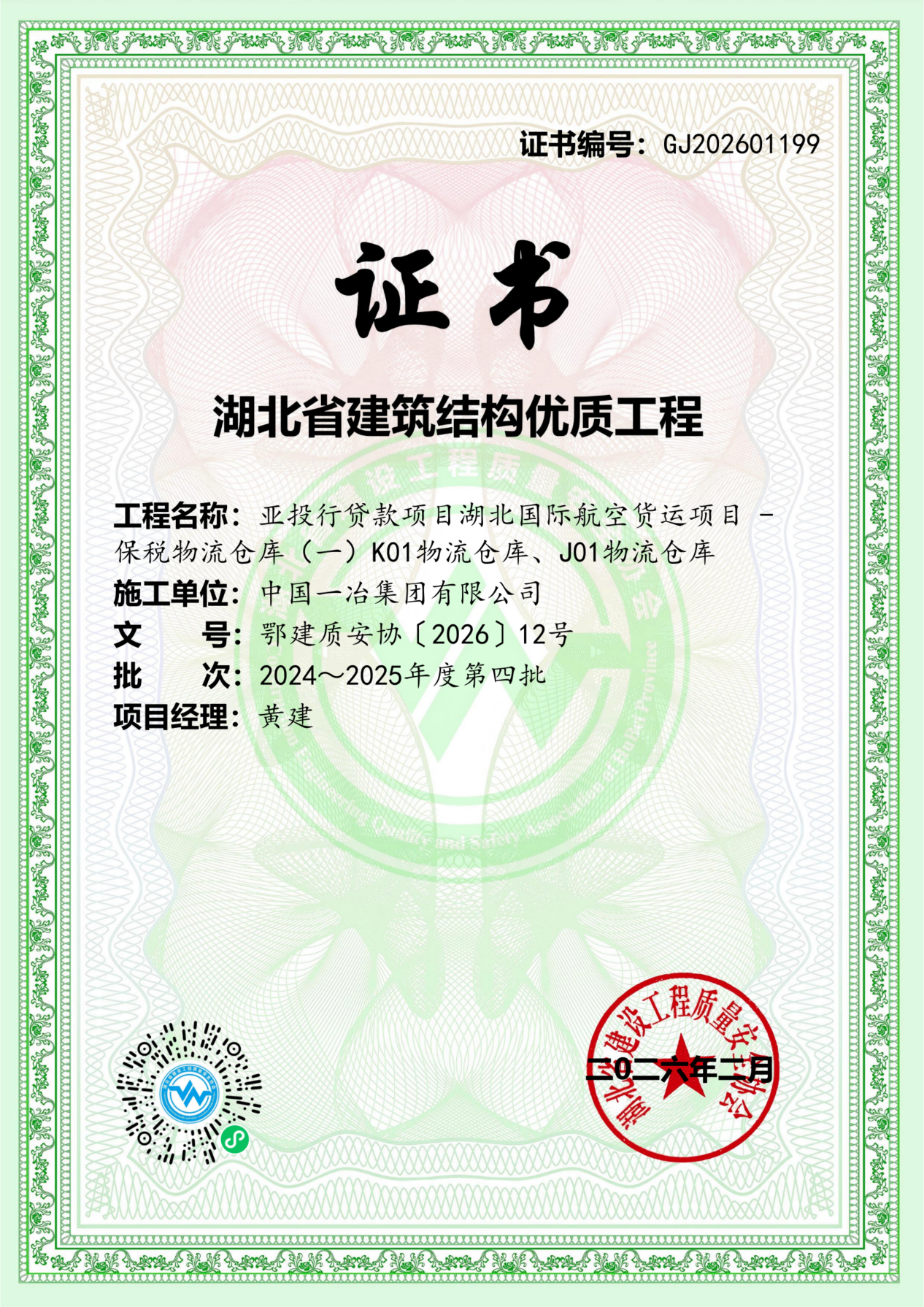 近日,湖北省建设工程质量安全协会发布评选结果,由中国一冶承建的亚投行贷款项目湖北国际航空货运项目——保税物流仓库(一),成功摘得2024-2025年度第四批湖北省建筑结构优质工程奖,为鄂州临空经济区建设再添省级质量名片。
