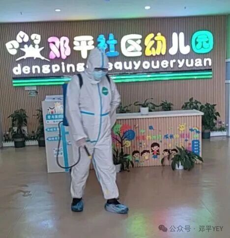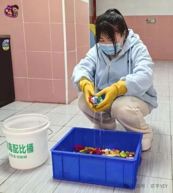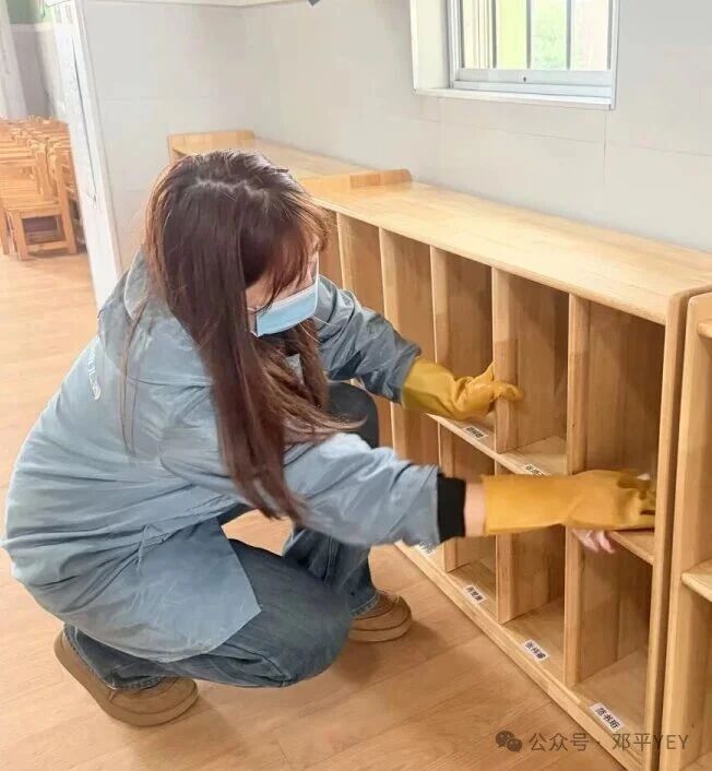老师每日对教室、寝室、玩具、餐具等高频接触区域全面消毒,并保持室内通风透气。