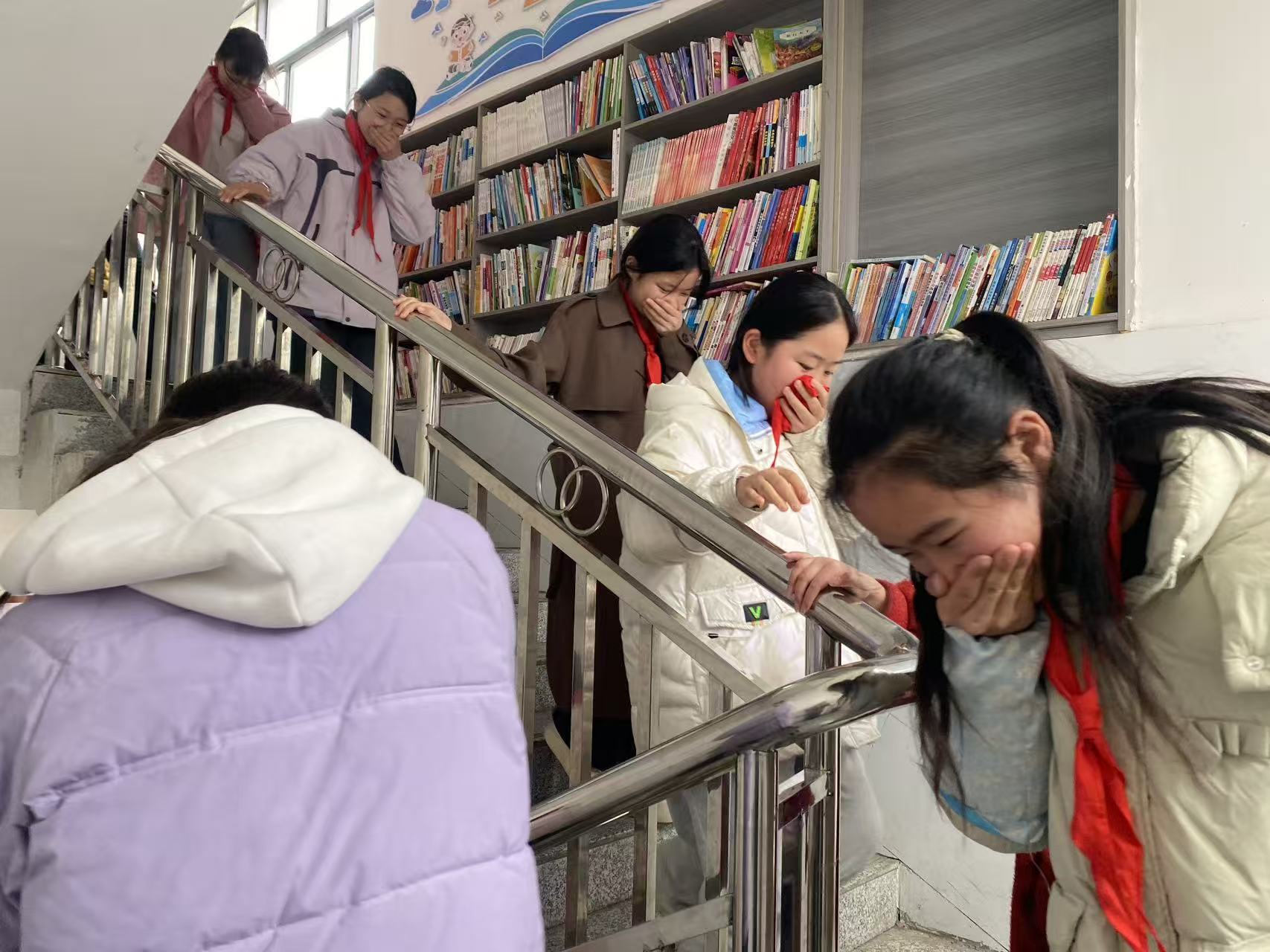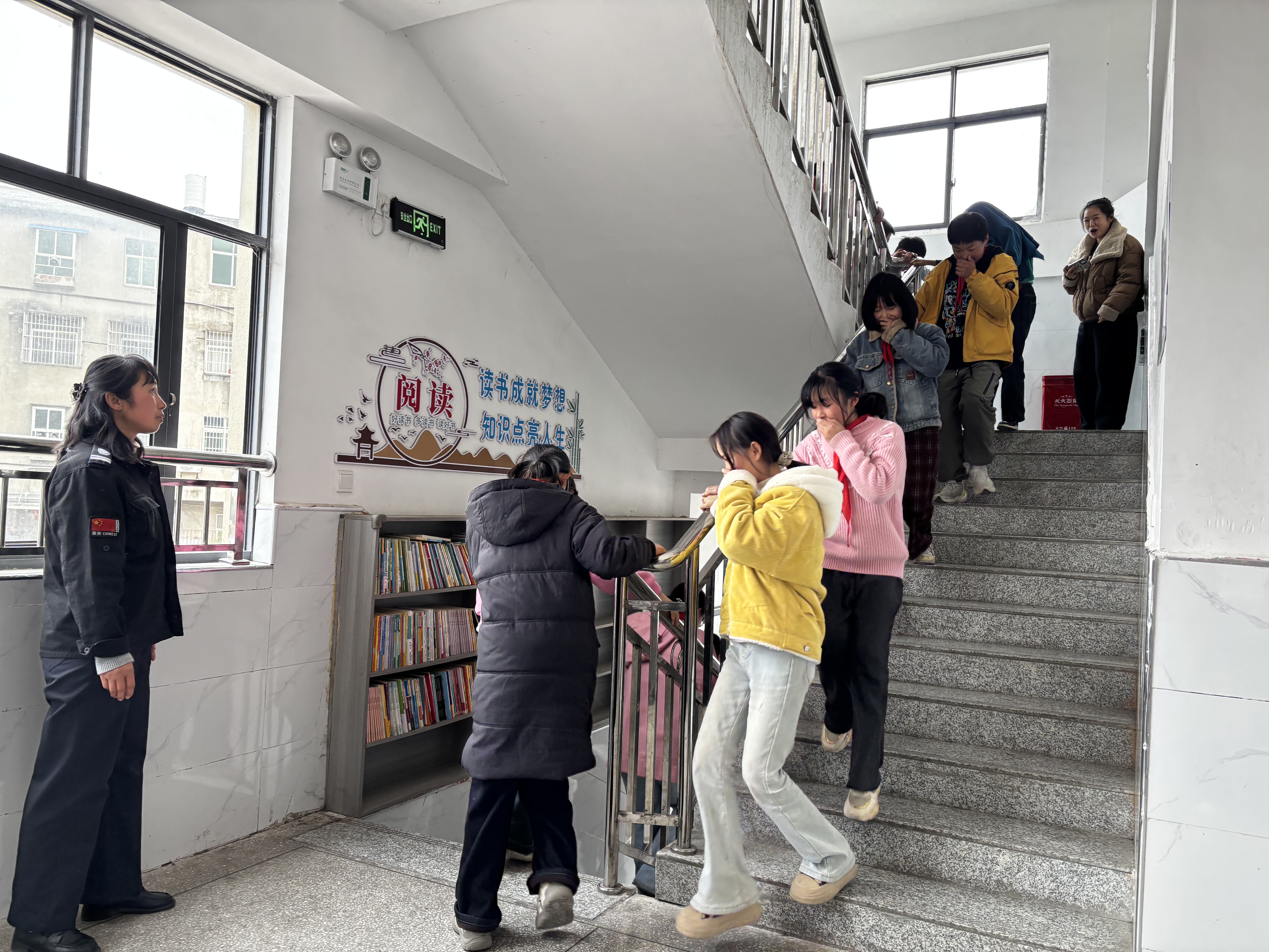 上午9时整,急促的消防警报声骤然响彻校园,演练正式开始。听到警报后,各楼层、各点位负责教师迅速到岗到位,沉着冷静地引导学生按照预定路线撤离;全体学生闻令而动,迅速从抽屉中拿出提前准备好的湿毛巾,捂住口鼻,弯腰低姿,沿着安全通道快速前行。楼道内,学生们井然有序,没有推搡、没有拥挤,只听到急促的脚步声和老师的引导声;楼梯转角处,负责教师及时提醒学生“注意脚下”“不要停留”,确保疏散通道畅通无阻。