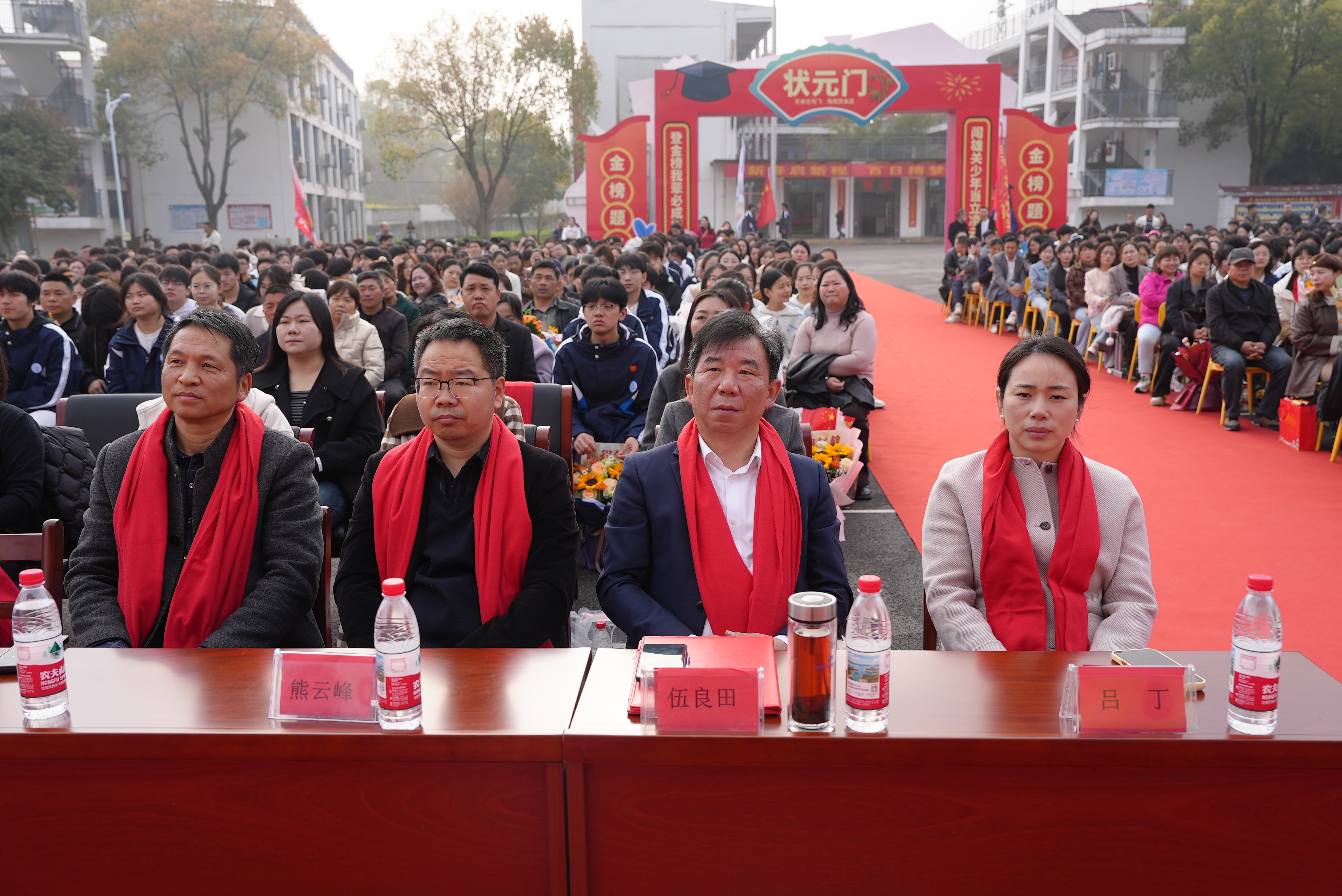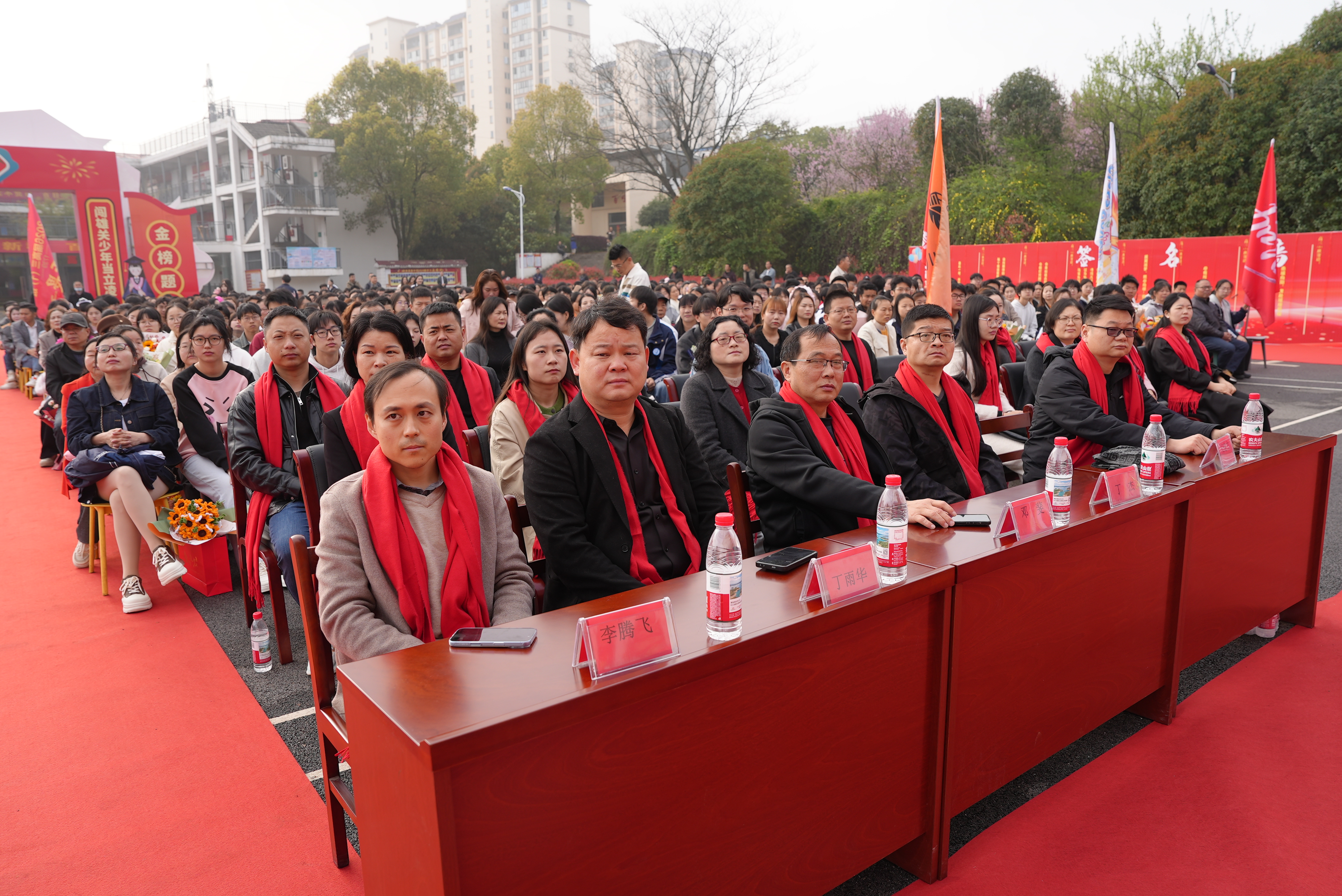 随后,班主任代表上台依次站一排,学校党总支书记伍良田和高三蹲级领导熊校长为各班授旗,旗帜就是方向,责任就是力量,每一面班旗都是战旗,承载着学校的信任和期望,更是沉甸甸的责任和担当,每位班主任接过旗帜,高高举起、和挥舞,象征着高三学子高考冲刺旗开得胜!随后高三全体教师上台,在年级组长陈主任的领誓下,共同宣誓,将以最饱满的热情、最昂扬的斗志,全力以赴,全程陪伴,严抓课堂,精准备考,耐心答疑,用心护航……,而后,高三全体学生以青春的名义共同宣誓:以拼搏为翼,以梦想为灯,不负父母的期盼,不负恩师的教诲,不负青春的理想,目标明确,自信自强,勤学苦练,意志如钢,珍惜七十天,让青春无悔……