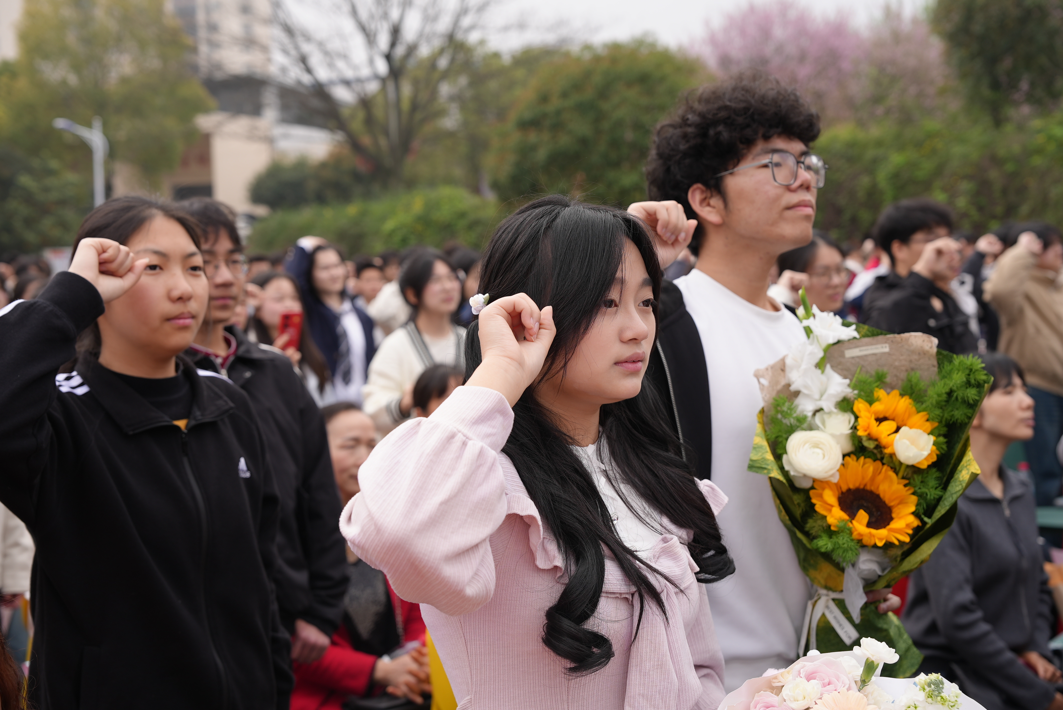 大会在庄严的升国旗、奏唱国歌中拉开序幕。高三学子们手捧鲜花紧挽着家长的手,按班级顺序依次走过“成人门”,“状元门”,踏上象征成长与希望的红地毯,学校领导、全体高三教师分列两侧,击掌致意,加油助威,用动作和声音传递力量和期许。