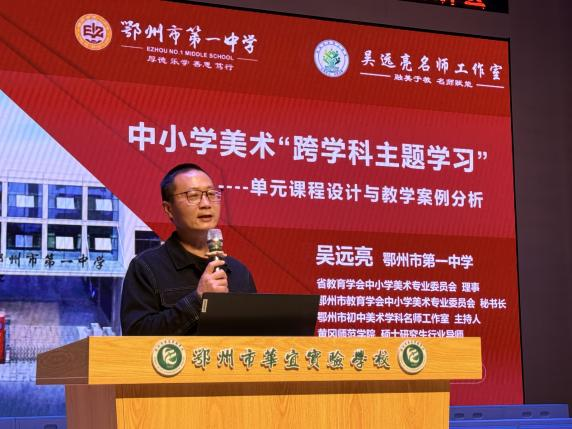 美术学科鄂城区兼职教研员吴远亮老师作《中小学美术跨学科主题学习 单元设计与教学案例分析》专题讲座,从跨学科的历史讲到未来,联通了从古至今的跨学科概念,明确如何跨多少的问题,为与会教师带来前沿理念与实践指导。