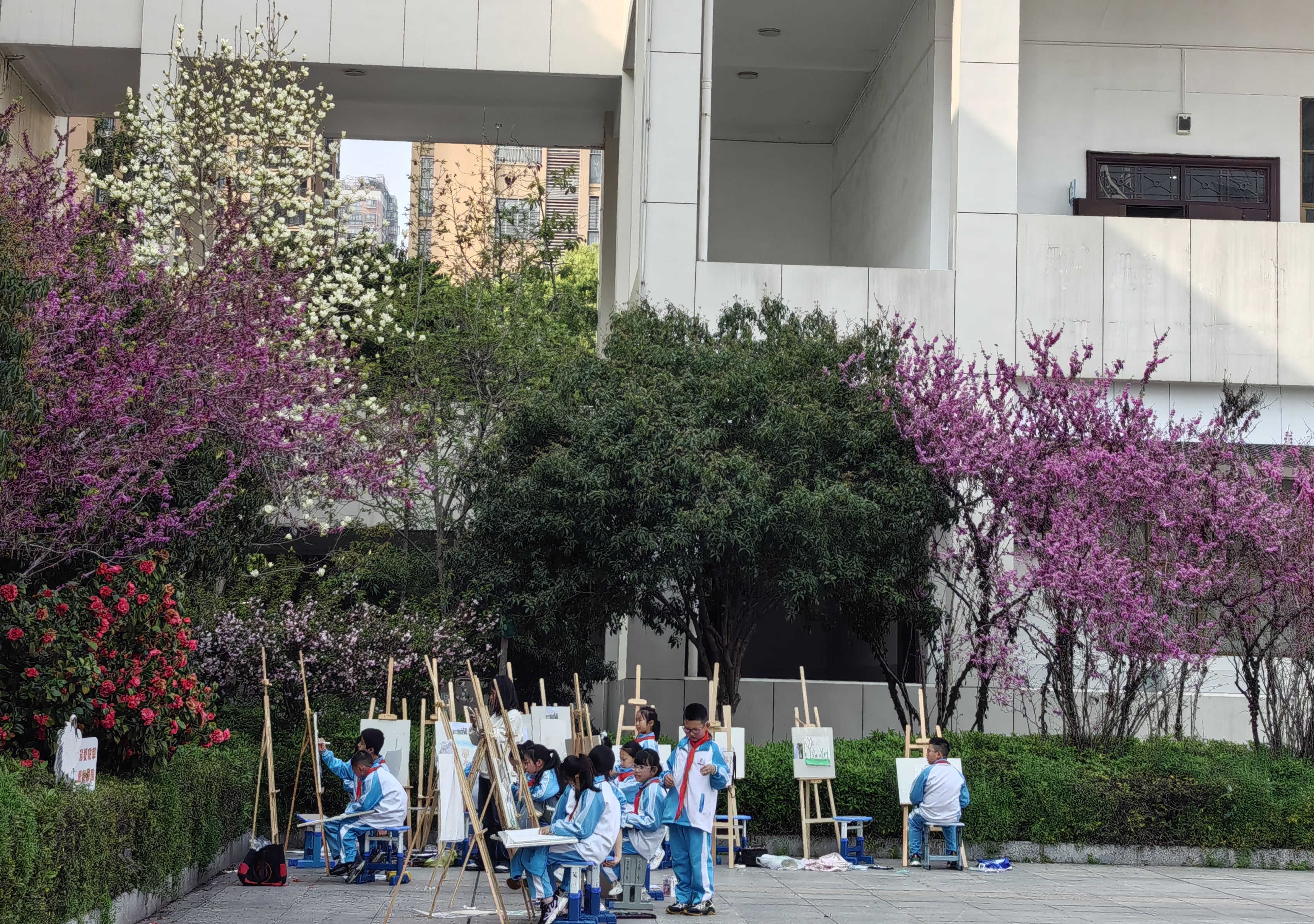 除了激烈赛事,该校的日常五育活动同样丰富多彩。焕然一新的“七彩运动角”,攀岩墙、趣味障碍赛让孩子们挑战自我;“阳光农场”劳动基地中,孩子们弯腰播种、观察菜苗,在泥土的芬芳中强健体魄;阳光下,孩子们或放眼远眺,或带着画板开展“春日写生”,用色彩涂抹粉白相间的花簇。