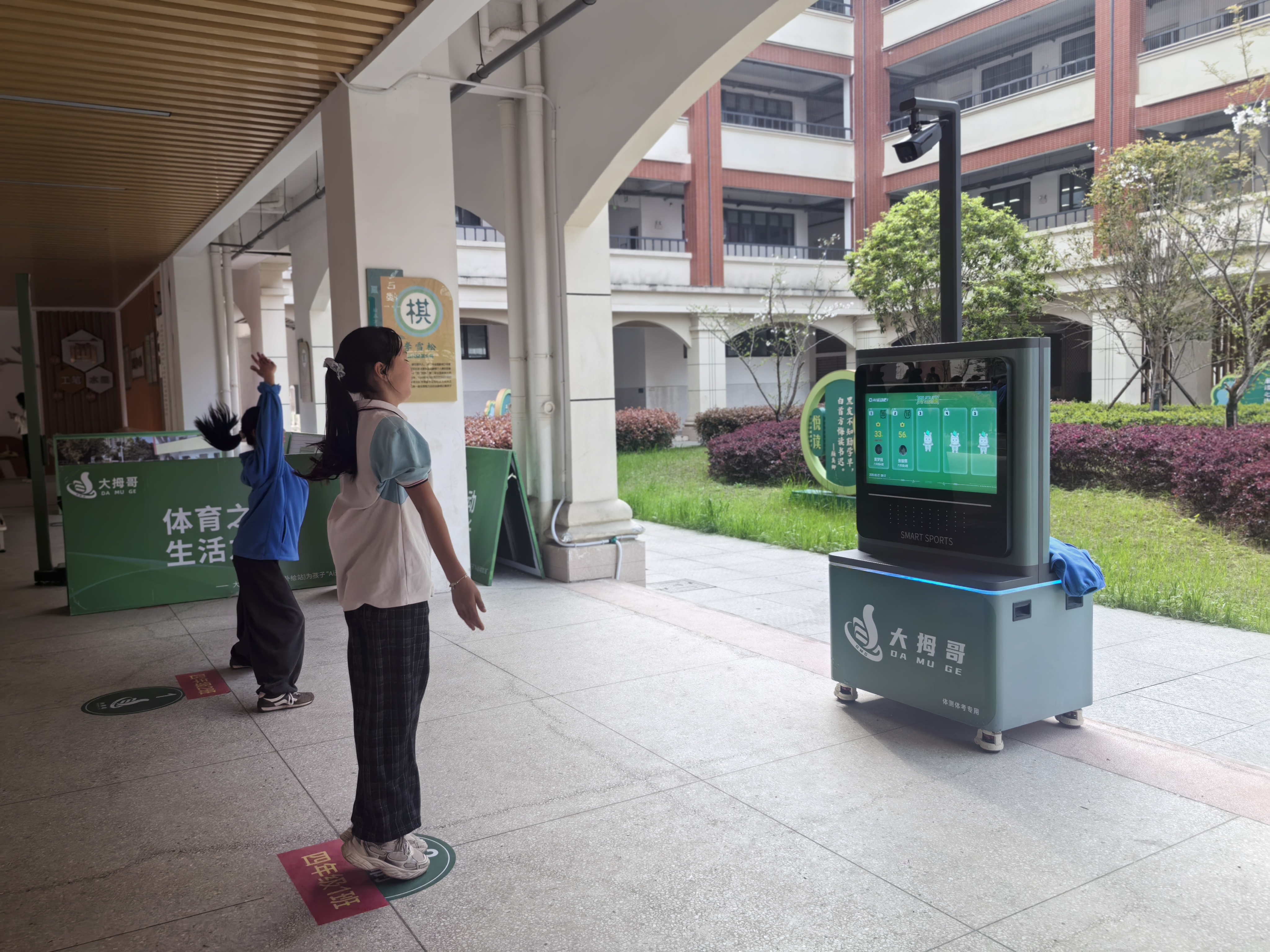若说“班超”是热血赛场,每日上午的大课间则是全员参与的“活力派对”。伴随着《弟子规》的鼓点,市武昌学校全体学生整齐列队做起特色韵律操,武术动作融入其中,刚柔并济。地面彩绘游戏巧妙融入体育、艺术、数学、安全等多学科元素,让孩子们在游戏中动手又动脑。最受欢迎的AI运动区,智能深蹲、开合跳等体验活动实时显示心率,运动数据生成“健康报告”,趣味与科学并存。
