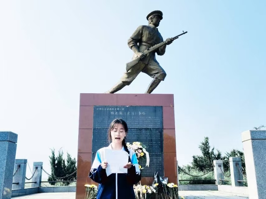 清扫工作结束,庄重的祭奠仪式正式开始。全体师生面向程正瀛烈士塑像整齐肃立,神情肃穆,低头默哀。全场静静追思英烈生平功绩,深切缅怀革命先辈为民族解放事业抛头颅、洒热血的赤诚初心与不朽功勋。