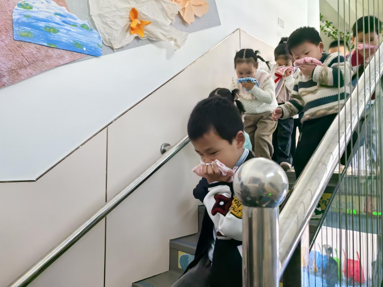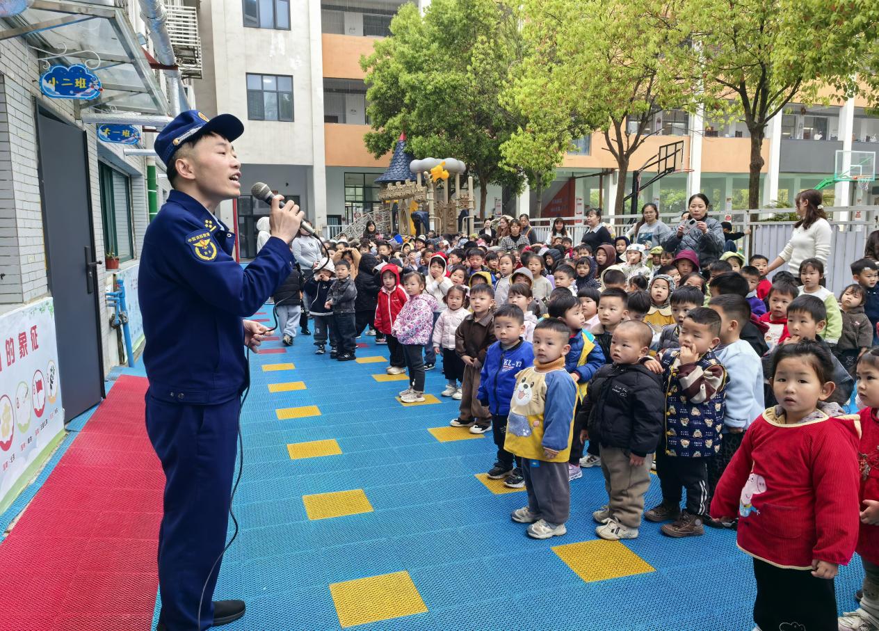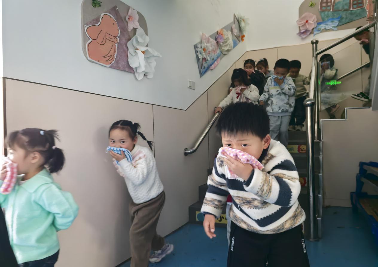 为让幼儿直观学习消防知识、掌握逃生技能,消防人员组织开展现场消防应急演练。随着警报响起,教师有序组织幼儿弯腰捂鼻、沿安全路线快速疏散至指定区域。
