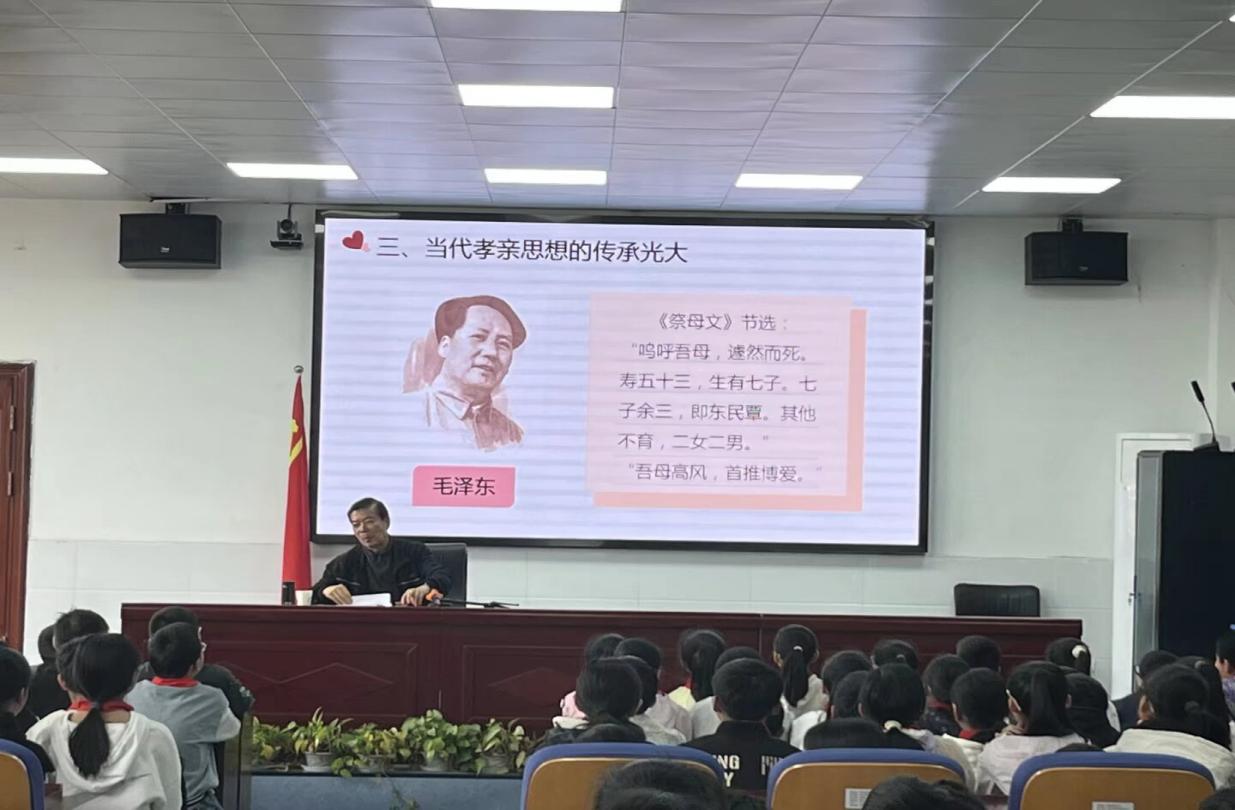 随后,余老师将孝亲文化与红色精神相结合,讲述当代孝亲思想的传承与光大。通过解读毛泽东同志的《祭母文》,感受他对母亲“恺恻慈祥、博爱真诚”的深切缅怀与赞颂;品读朱德同志《回忆我的母亲》,体会革命先辈从母亲身上汲取勤劳坚韧的精神力量,将对母亲的孝转化为报国为民的大爱;学习宋庆龄同志与保姆的深厚情谊,领略她平等待人、敬老爱幼的高尚品格;研读陈毅同志致父母的家书,感悟老一辈无产阶级革命家对双亲的敬重牵挂与赤子深情。这些红色故事让同学们懂得,孝老爱亲不仅是传统美德,更在新时代被赋予了感恩家国、担当责任的全新内涵。