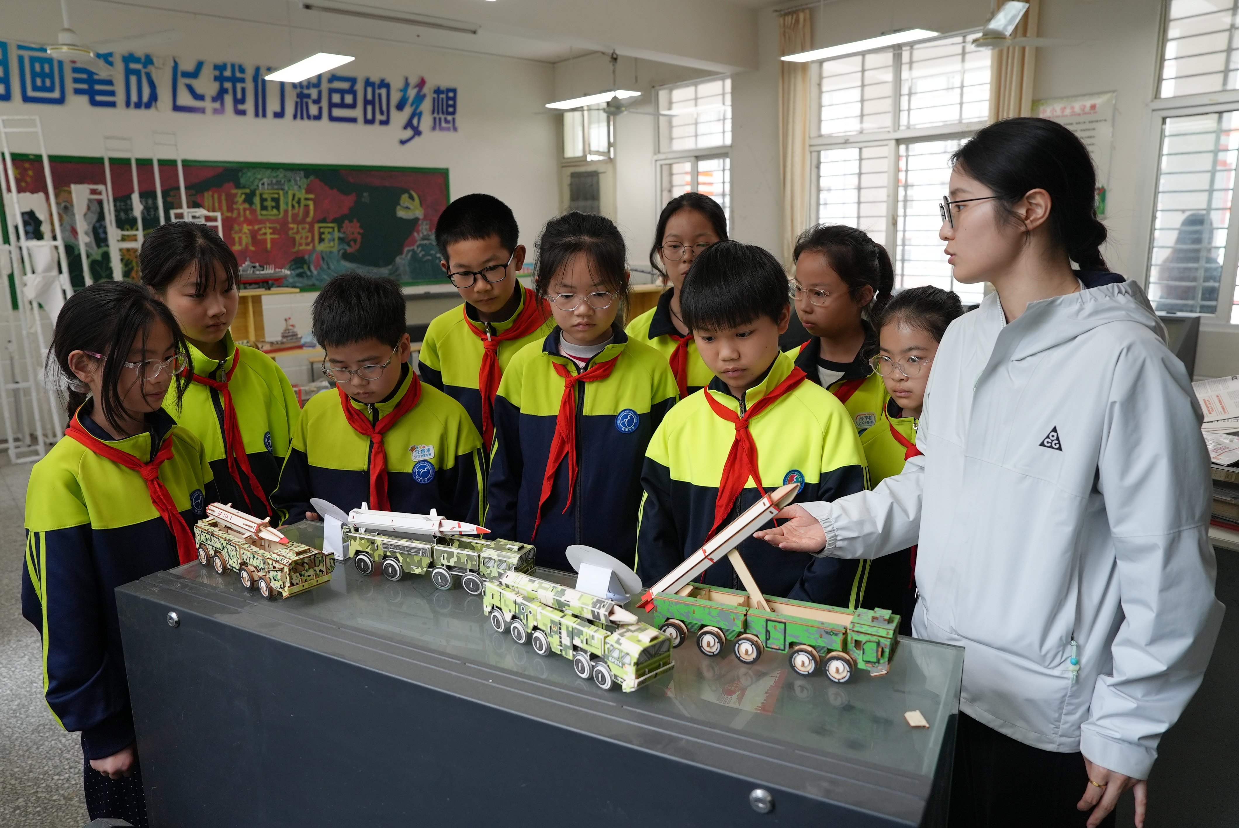 与此同时,学校组织学生开展国家安全日有奖知识竞赛、“爱我国防”主题演讲比赛等丰富多彩的活动,以赛促学、以学促行,激发学生学习国家安全知识的积极性。在老师的引导下,部分学生参观了武器和卫星模型,直观了解国防知识,厚植爱国情怀,增强国防观念。