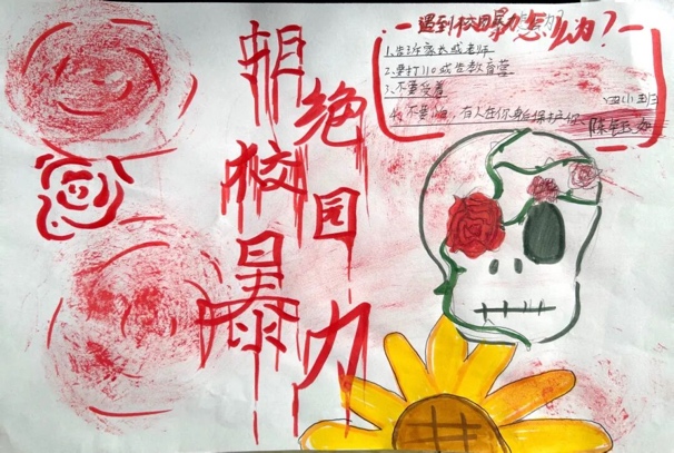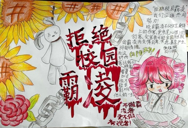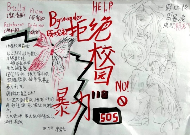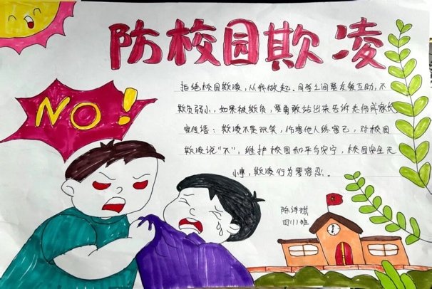 在手抄报创作活动中,学生们化身为反欺凌宣传使者,以画笔为载体、文字为心声,将对校园欺凌的认知与反对态度落于纸面。有的用创意盾牌艺术字写下“拒绝暴力”,有的清晰标注欺凌常见表现与求助渠道。优秀作品集中展示后,成为校园里一道醒目的风景线,让反欺凌理念以可视化的方式广泛传播,成为流动的反暴宣言。