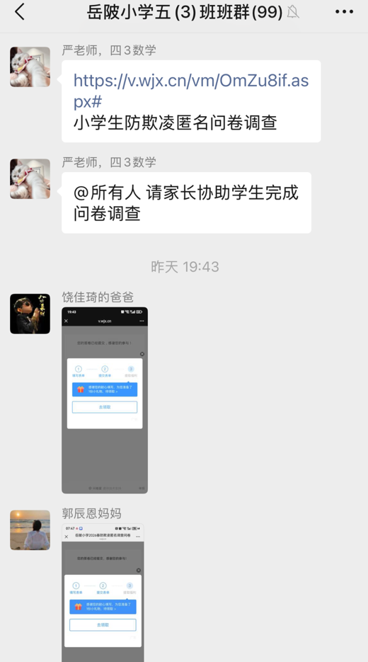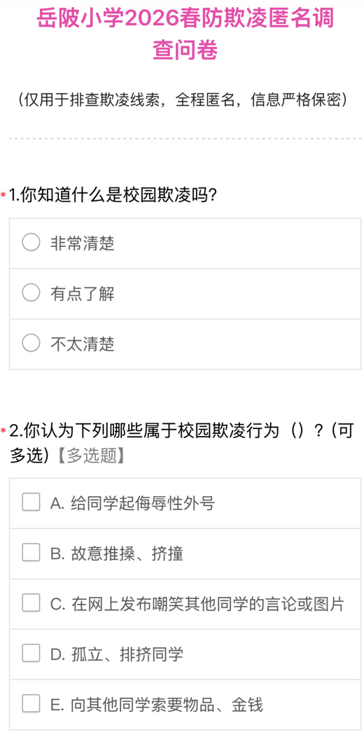 为全面掌握学生对校园欺凌的认知程度、校园潜在欺凌风险点,学校面向全体学生开展防欺凌专项问卷调查。通过匿名填写的方式,鼓励学生真实反馈自身见闻与感受,为后续更有针对性地优化防欺凌教育与干预举措提供数据支撑,进一步筑牢校园安全防线。