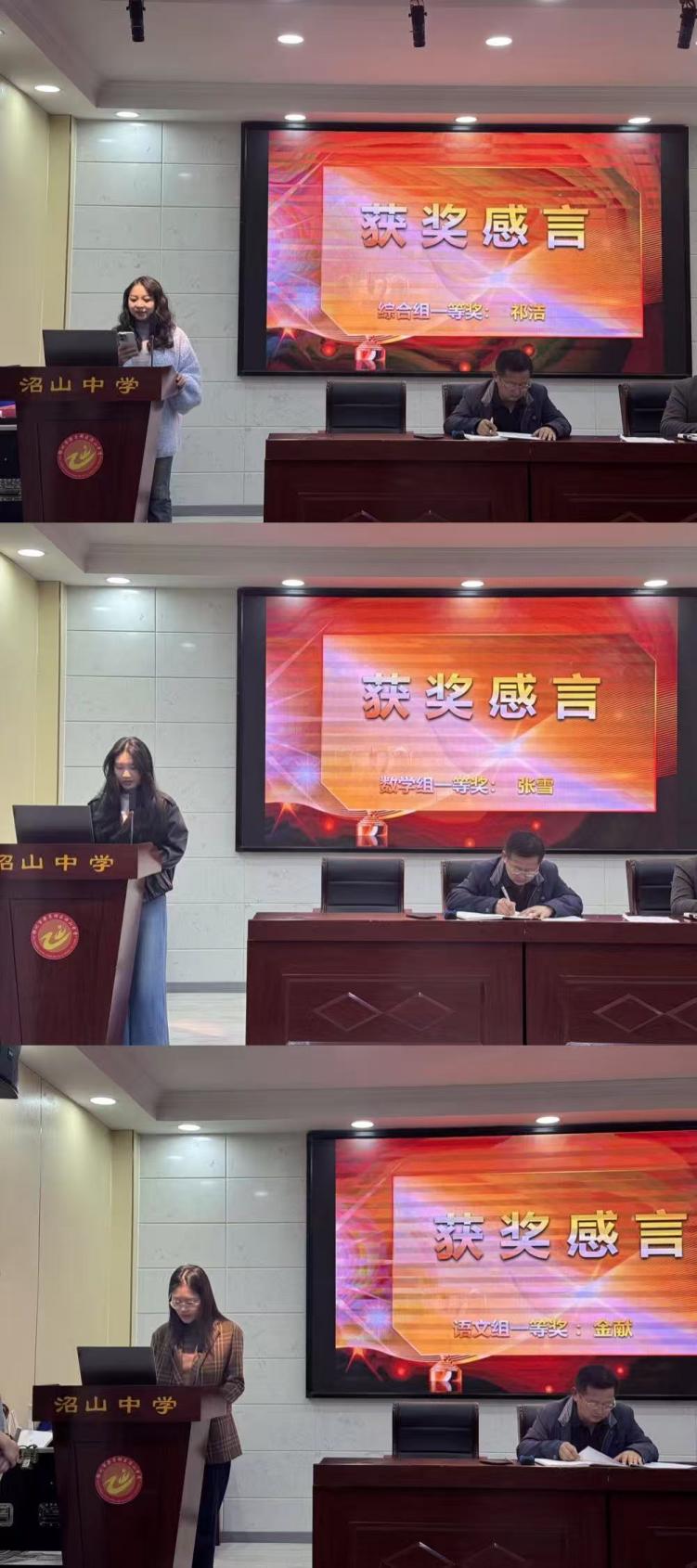 随后,获奖教师代表依次分享心得。语文组一等奖金献老师感恩活动提供的成长平台,坦言收获满满,期盼学校多举办此类助力青年教师提升的活动。数学组一等奖张雪老师分享教学心得,倡导课堂教学删繁就简、聚焦重难点,引导学生深度学习,培育自主学习能力。综合组一等奖祁洁老师结合获奖感悟,分享了活跃课堂氛围、激发学生兴趣的实用技巧。