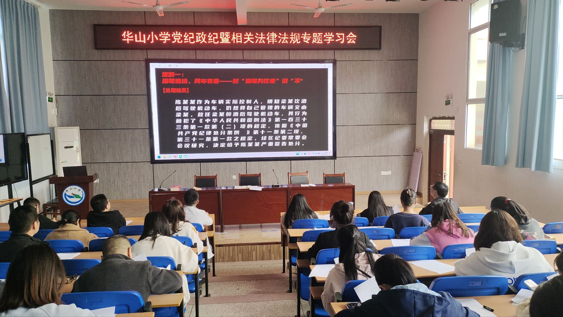 随后,刘海峰校长和纪星河书记带领全体教职工开展党纪政纪与法律法规专题学习,重点解读了《中国共产党纪律处分条例》中关于酒驾醉驾等违法行为的纪律处分条款、《中华人民共和国道路交通安全法》《中华人民共和国刑法》中酒驾醉驾的认定标准与处罚规定,同时结合教育系统师德师风建设要求,明确了教职工违纪违法的处理办法,强调教师作为公职人员与育人者的双重责任,引导大家以身作则、为人师表。