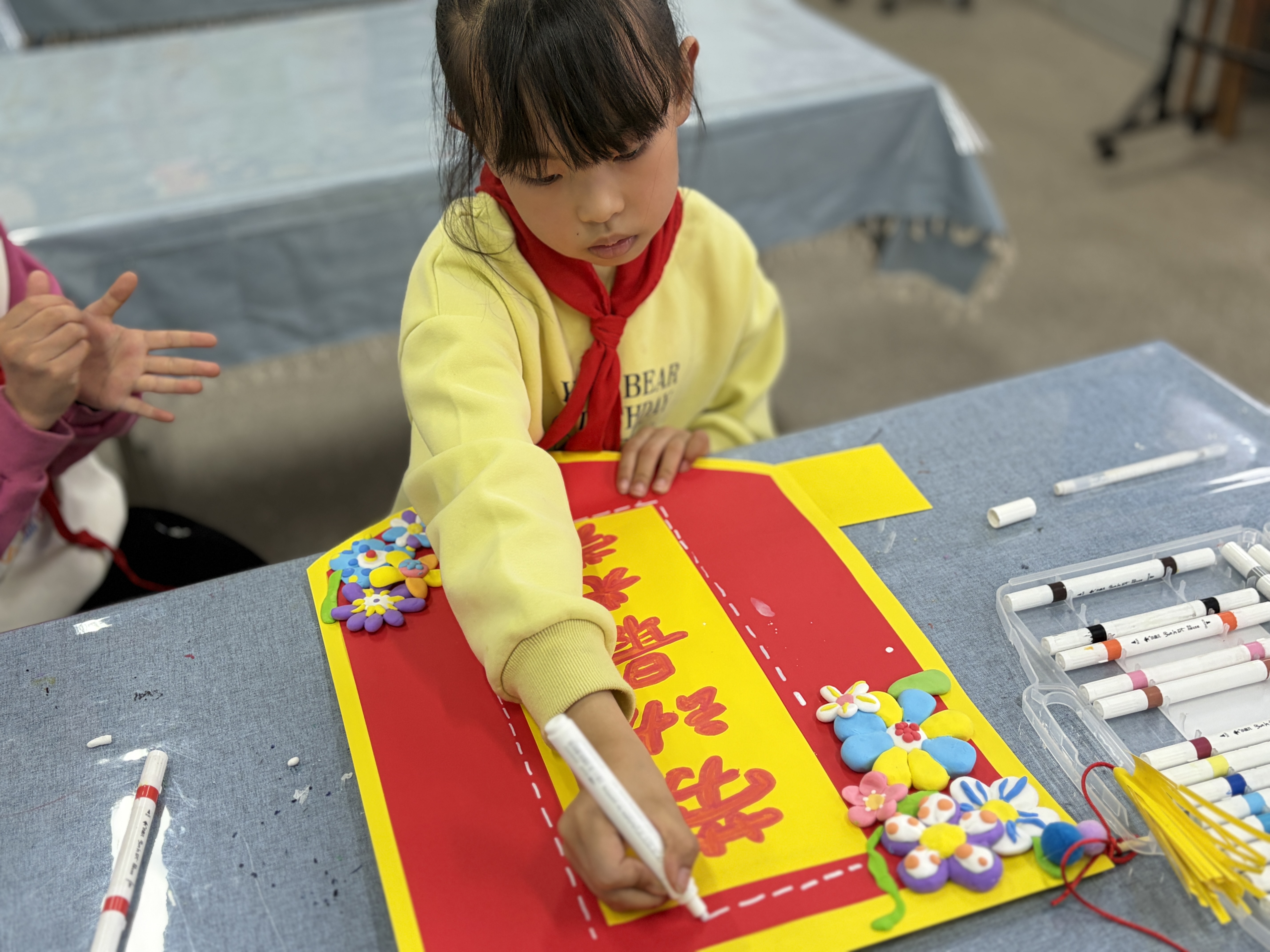 活动现场,孩子们兴致满满、热情高涨。在美术社团老师的耐心指导下,同学们以彩色卡纸为基底,搭配色彩缤纷的超轻黏土,分工协作、默契配合,开启了趣味满满的手工创作之旅。大家发挥奇思妙想,用黏土精心捏造出一朵朵鲜活灵动的花朵、一个个精致可爱的装饰图案,小心翼翼地粘贴、点缀在卡纸上,一步步将普通的手工材料,变成一面面充满童趣与心意的手工锦旗。