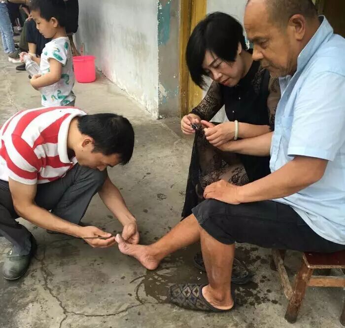 (图为民建会员严陶为老人剪指甲。)